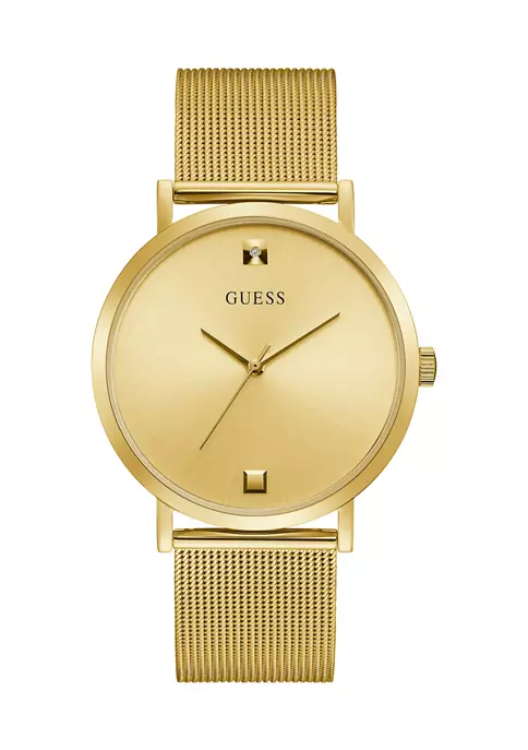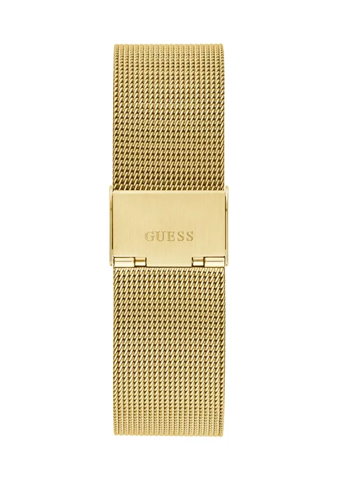 Bling it on with this oversized timepiece! Boasting 133 crystals on the case and multifunction movement, this gold-tone case watch from GUESS® paired is sure to grab everyone’s attention.