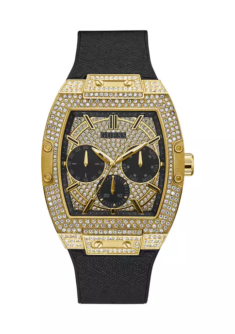 This multifunction watch from GUESS® features day, date, and 24-hour international time subdials. It’s finished with a stainless steel case with crystals and is water-resistant up to 50 meters.