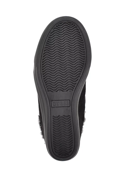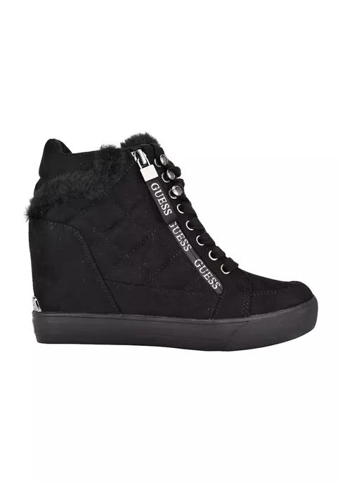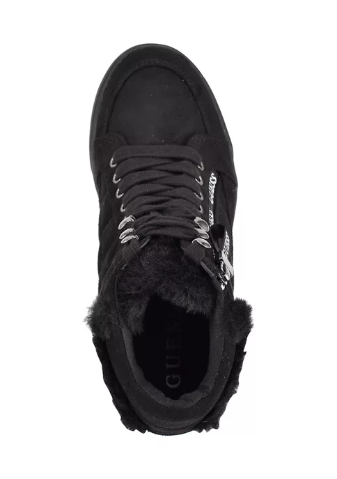 The Dayli high top sneakers from Guess feature a faux fur trim with a quilted pattern along the upper.