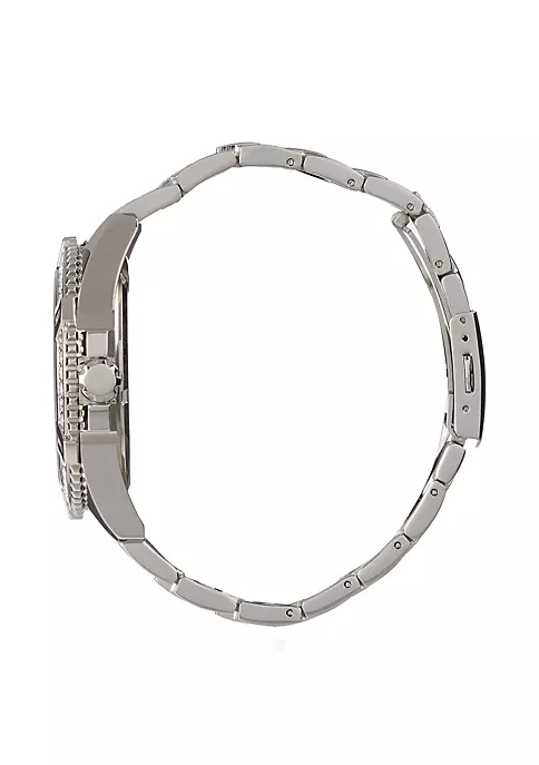 The mineral crystal on this timeless Guess Frontier watch will add flair to any outfit. This watch is capable of being water resistant up to 100 meters / 330 feet / 10 atm . This is a watch you can rely on to keep you on time even when the day suddenly becomes hectic and disorganized. A silver stainless-steel band with a practical clasp keeps this watch sturdy. Stay on trend and add this Guess Frontier timepiece to your wardrobe now to give your next outfit a fresh new look.
