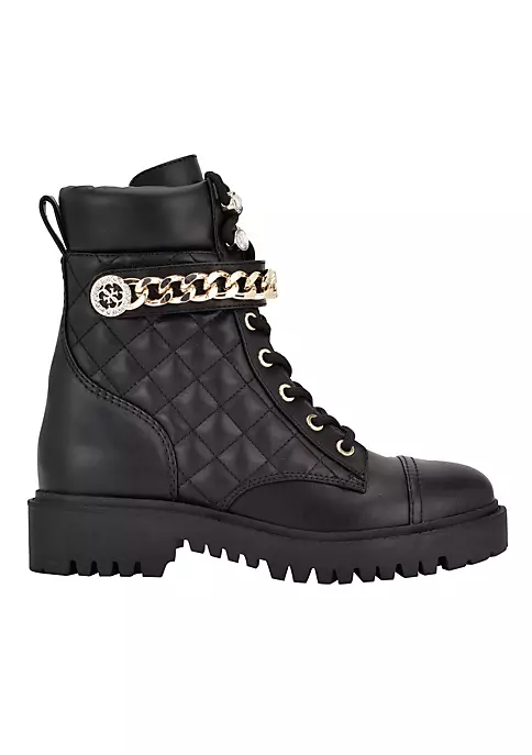 Featuring diamond quilting, shimmering embellishments and gold tone curb chains, this pair is a feminine, glamorous reimagination of combat boots.