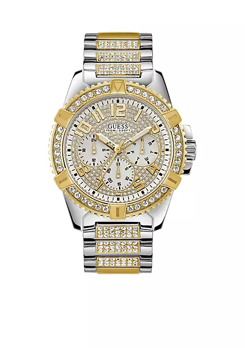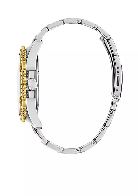 Form and function combine gracefully in this polished steel and gold-tone presence watch. Mixing feminine charm and show-stopping style, this multi function, water resistant piece ensures trend-savvy sophistication every time you wear it.