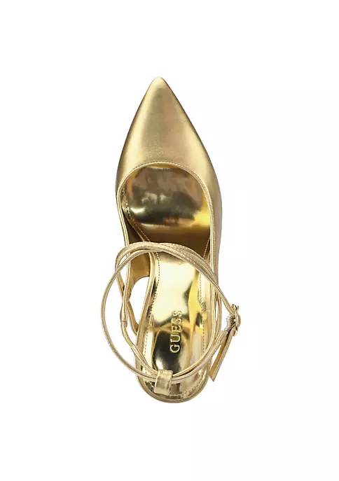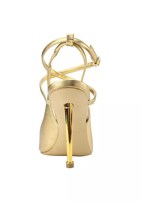 The Staton pump shows off a beautiful strappy upper with ankle buckle closure on a modern gold metal heel