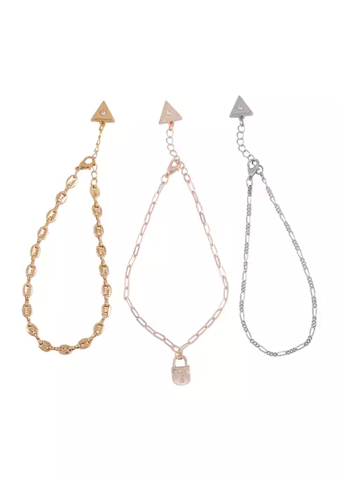 This set of 3 anklets from GUESS spans 3 color tones, with lovely chain styles and a padlock pendant. Member of the Anklet Item collection.