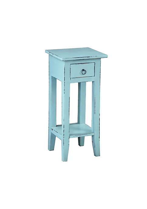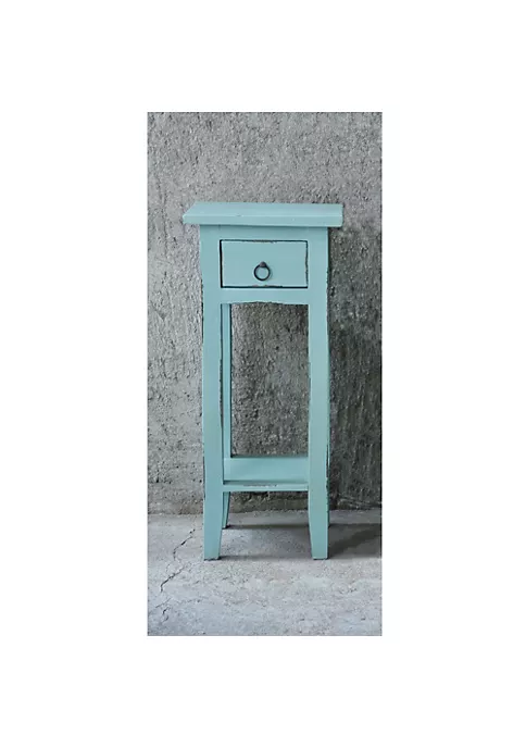 Perfect sofa or bedside accent this cottage chic end table is a stylish stage for charging a phone or favorite book. This two-tiered distressed small side table will add flair to any tiny space you have to spare. Stowaway essentials in the handy drawer. The shelf is ideal for hand towels a basket with toiletries or an essential oil diffuser!