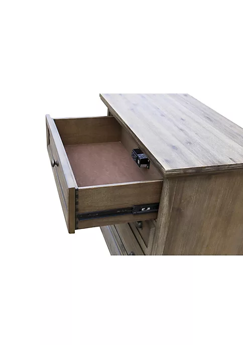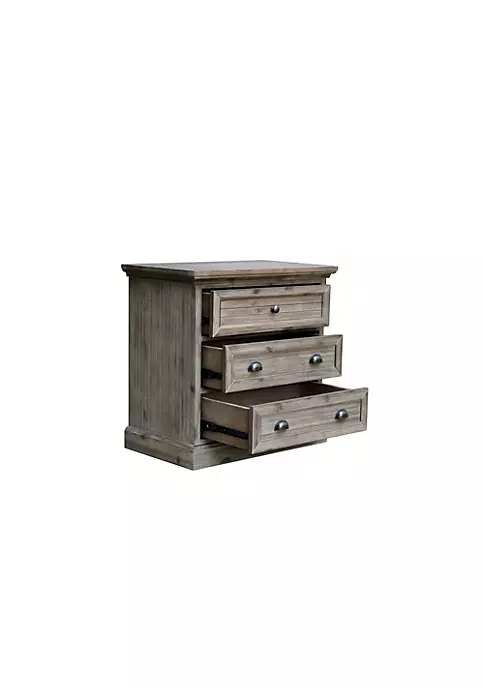 transitional gray tone bedside table allows easy access to your sleep essentials placed next to your upholstered bed or matching wood shutter headboard (available separately). Framed door panels create depth and variation you will sense the rich organic quality of solid acacia wood each piece hand rubbed exposing natural grains and distressing. Industrial cottage coastal or shabby chic any accessories and colors you love will blend with this neutral bed side table. Update your ski chalet liven up your home by the lake this transitional gentleman’s chest will add warmth and style to your bedroom living room or entryway.