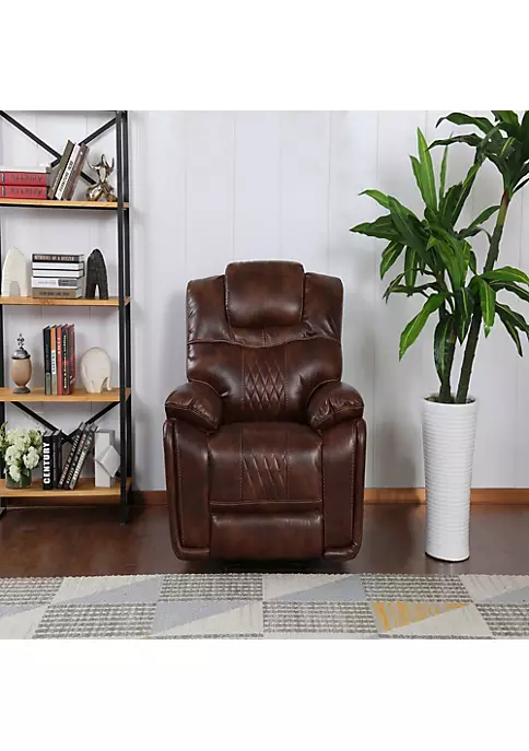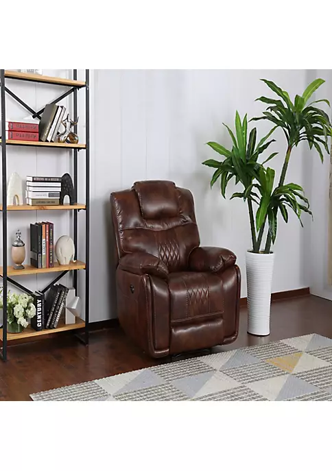 Sophisticated reinforced luxury stitching on the back cushion and leg rest adds depth and character to this elegant recliner with USB ports. No gap in the leg rest for a seamless chaise which is safer than reclining furniture with an opening when stretched out no risk of your foot leg or child’s arm getting caught in the slit. Strong rich brown leather-like upholstery with a breathable backing that is ideal to keep you cool in warm climates and will not fade in sunlight. Pieces are sold individually or as a relaxing living room set. Look no further your ultimate seating experience is just a click away!